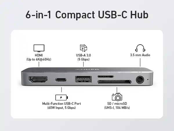 The Anker 541 USB-C Hub (6-in-1) (Model A8363HA1) is a powerful and versatile solution for expanding laptop connectivity, featuring an array of high-speed ports, including an upgraded **4K@60Hz HDMI** port for smooth video output.